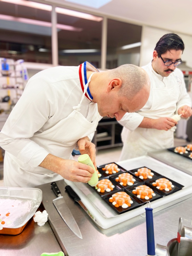 Le MOF Milan Radanovic a animé, les 26 et 27 janvier, un stage de haute facture tourné vers la promotion d’une offre traiteur printanière. Deux journées inspirantes durant lesquelles le charcutier-traiteur rennais a déployé tout son art à l’élaboration d’une gamme diversifiée de produits, déclinés en recettes originales alliant recherche de saveur et exigence esthétique. Au programme : « cannelloni de crabe et citron », « tarte tomate », « duo de saumon et cabillaud », « agneau printanier », « dos de merlu, carottes », « pintade aux asperges ».