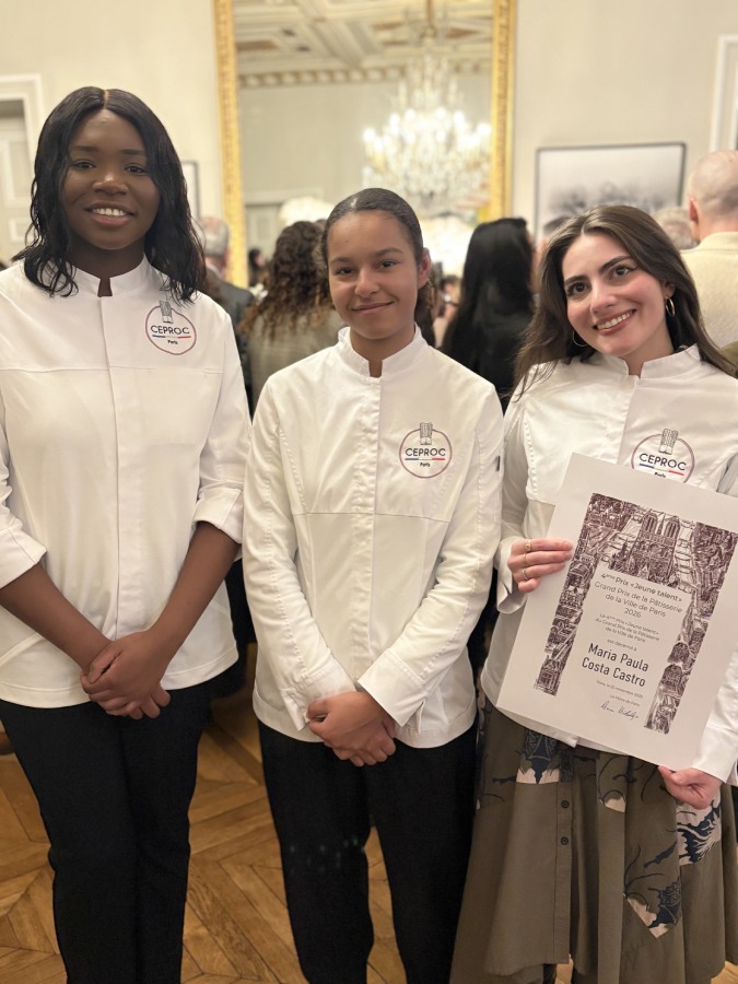 La 6ème édition du Grand Prix de la pâtisserie de la Ville de Paris a livré son verdict le 25 novembre dernier. Les résultats ont été proclamés par la maire de la capitale Anne Hidalgo, en présence du parrain et coprésident du concours le chef Pierre Hermé. Trois apprenties pâtissières du CEPROC étaient en lice : Abigaëlle Masunda en BTM, Jannys Gane et Maria Paula Costa en CAP. Elles ont crânement défendu leurs chances dans une épreuve très disputée qui a vu la participation de 14 candidats. Sur le podium, l’apprentie Maria Paula Costa s’est vue décerner la quatrième place, un résultat méritoire.